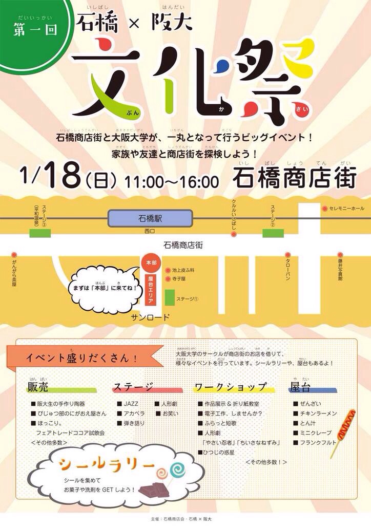 阪大と石橋商店街の仲を深め、互いにより発展していくことを目標に活動なさっている阪大生の団体です。そんな石橋×阪大が主催のイベントが